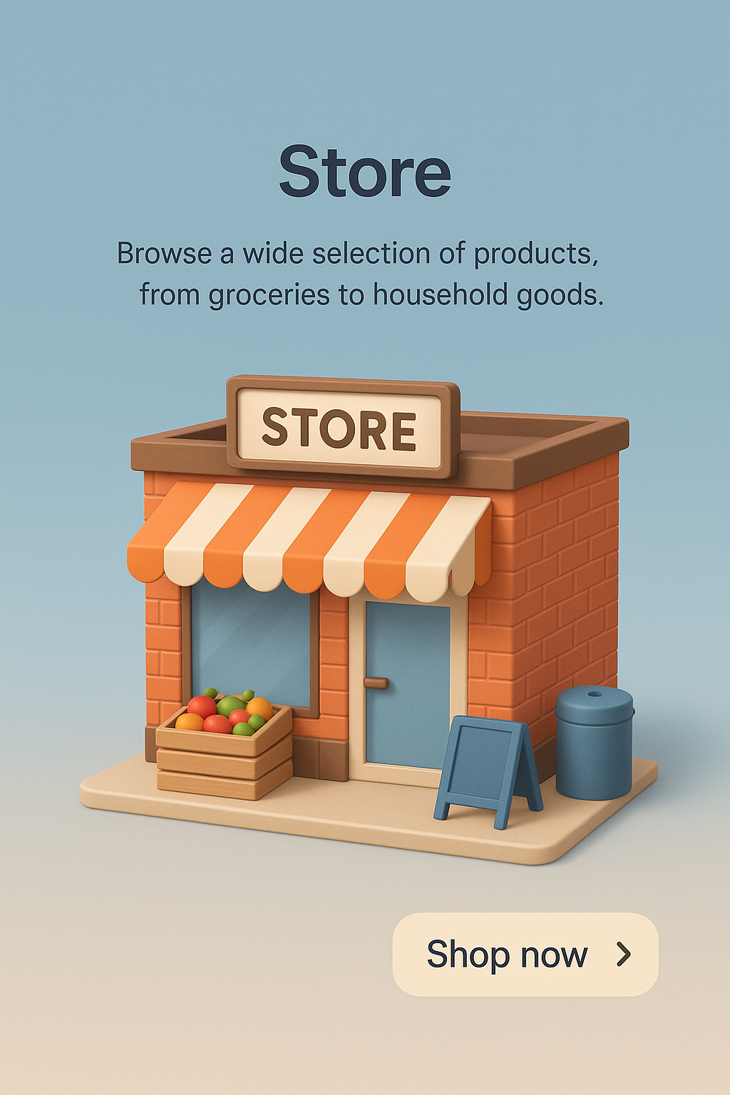 /Collection: /by davooda/Type: PNG/A detailed 3D illustration of a store featuring a vibrant shopfront, awning, and a display of fruits. The design is zoomed out to capture the entire scene with a smooth gradient background.