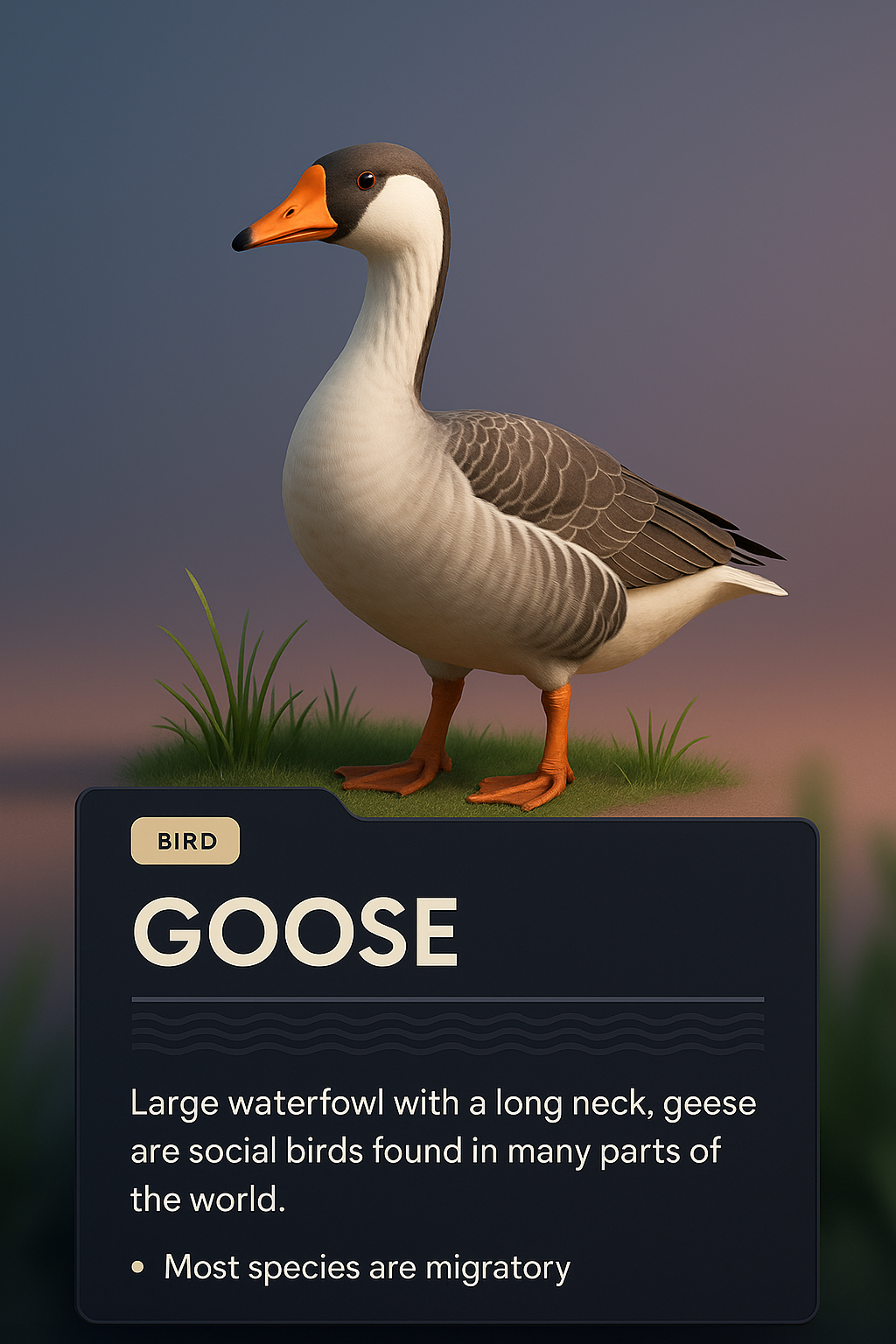 /Collection: /by davooda/Type: PNG/A 3D illustration of a goose set against a smooth gradient background. Includes design blocks with informative text and graphical elements, creating a cohesive visual theme.
