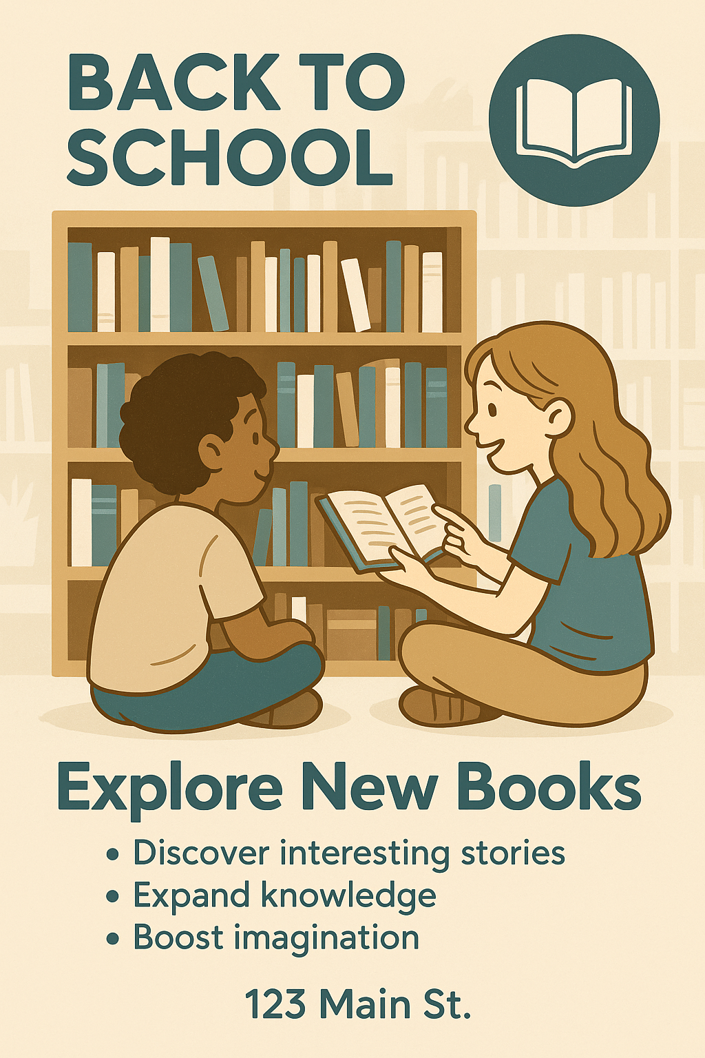 /Collection: /by davooda/Type: PNG/Illustrative graphic promoting book exploration for students, featuring two children engaging with books. Ideal for educational settings and library promotions.