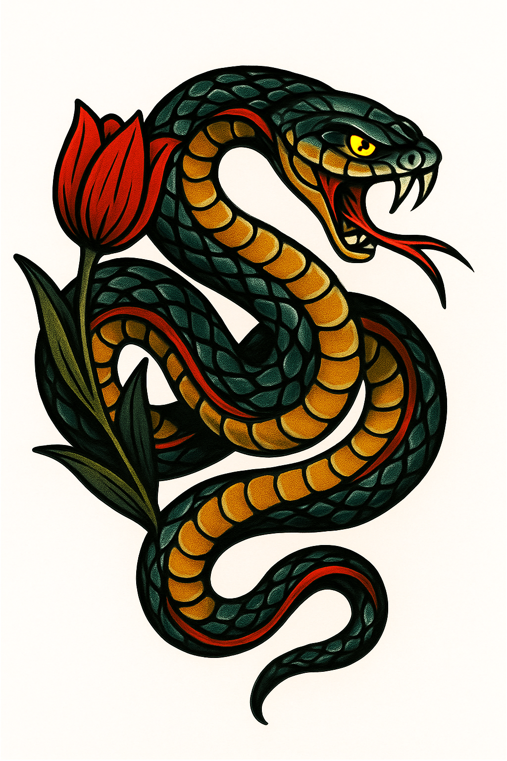 This image features a bold tattoo design showcasing a snake intertwined with a tulip, characterized by vibrant colors and a traditional art style. It's ideal for tattoo enthusiasts and artists.