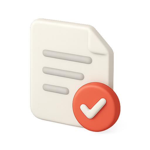 Stylized 3D icon representing a document with a checkmark, ideal for applications related to document verification, approval processes, or task completion.