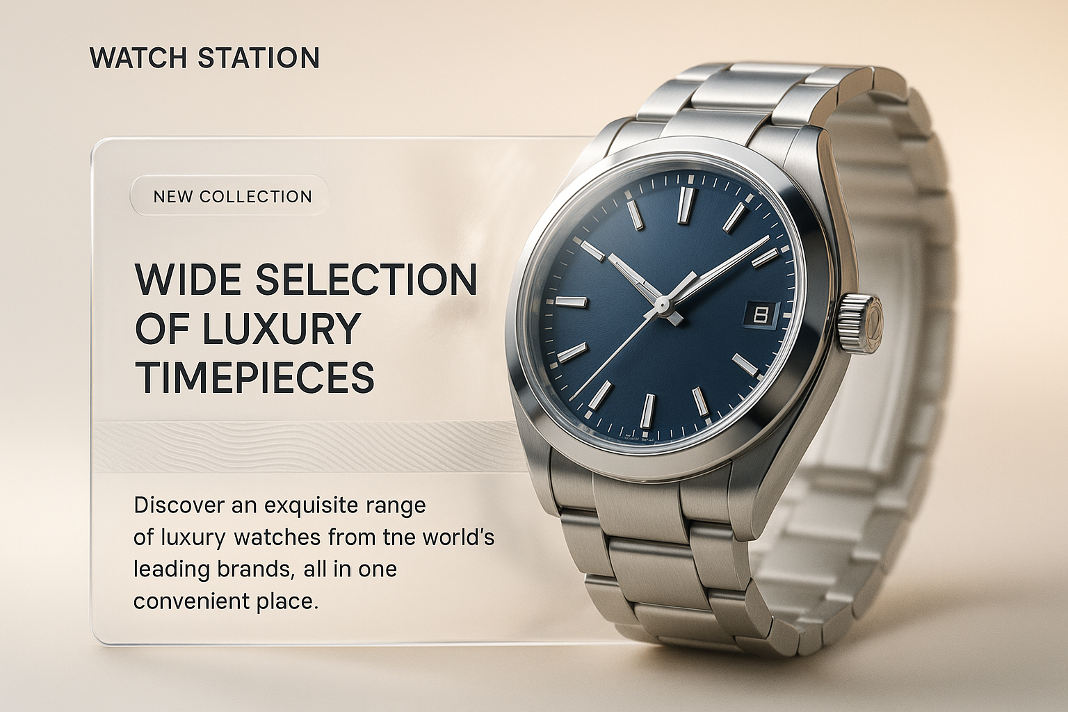 /Collection: /by davooda/Type: PNG/A sophisticated web page design showcasing luxury timepieces. Features a prominent watch illustration, a stylish overlay with a transparent effect, and elegant typography.