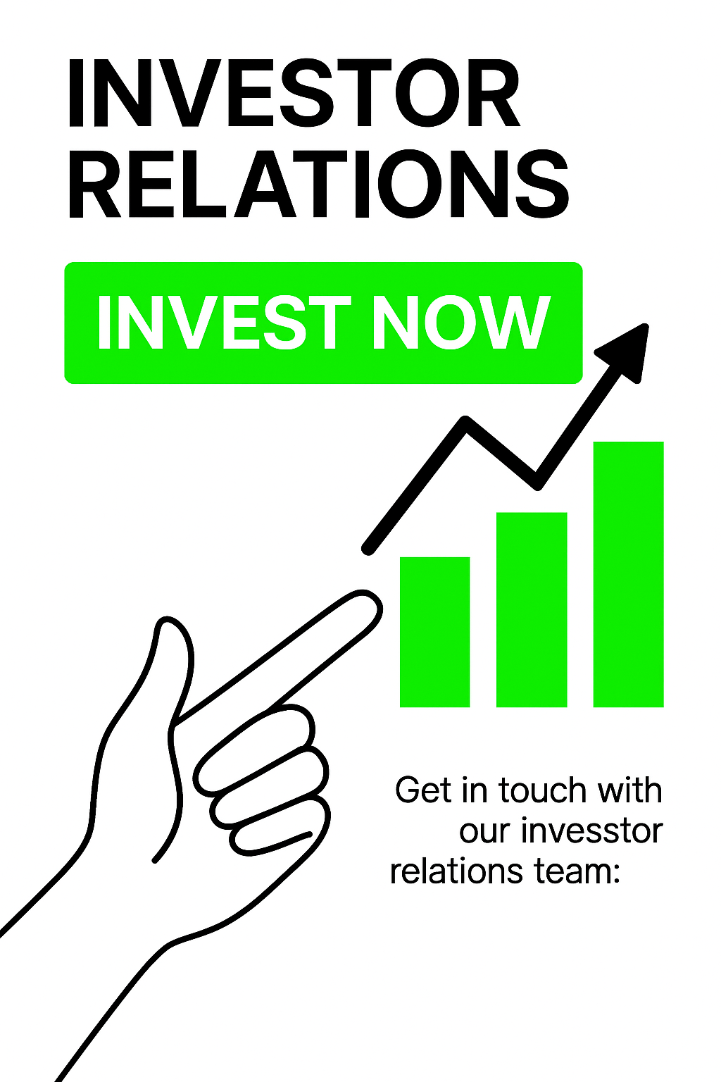 /Collection: /by davooda/Type: PNG/A promotional graphic designed for investor relations, featuring a hand pointing towards a growing bar chart. The modern design is aimed at encouraging potential investors to engage with the team.