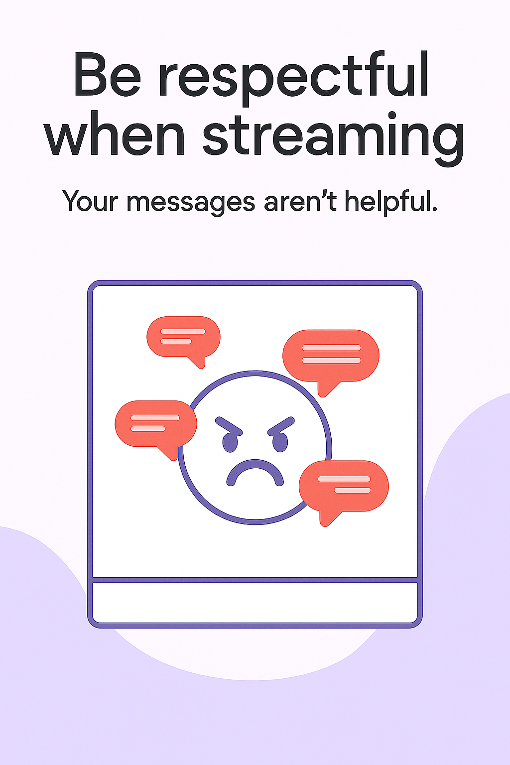 /Collection: /by davooda/Type: PNG/Engaging social media graphic highlighting the importance of respectful communication during streaming. Features a cartoonish emoticon with speech bubbles, designed for online community engagement.