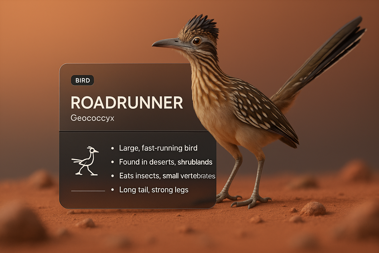 /Collection: /by davooda/Type: PNG/A stunning 3D illustration of a roadrunner set against a gradient background. The design includes informative blocks with a dark label, showcasing details about the bird's habitat and characteristics, seamlessly integrated into the composition.