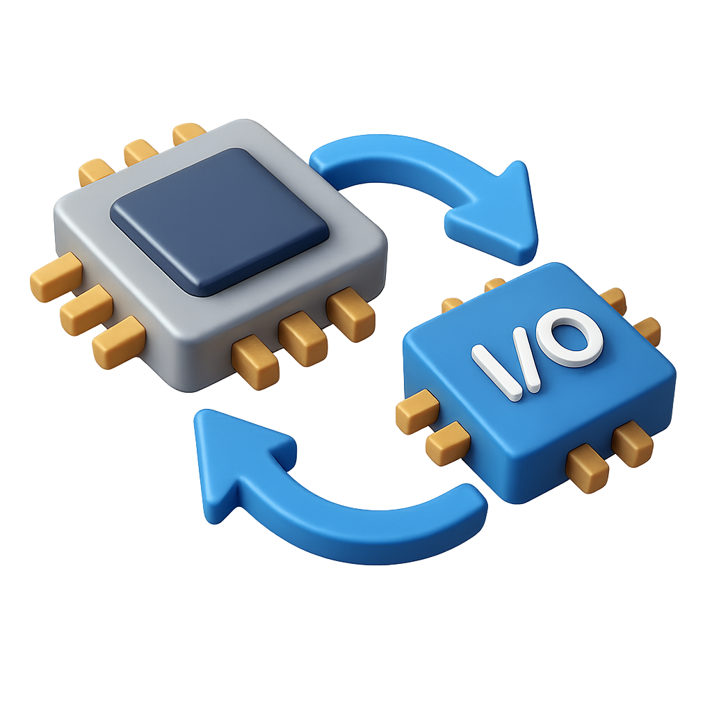 /Collection: /by davooda/Type: PNG/A visually striking 3D icon depicting two I/O processors with arrows indicating data transfer. The design features a transparent background and an isometric view, emphasizing a modern tech aesthetic.