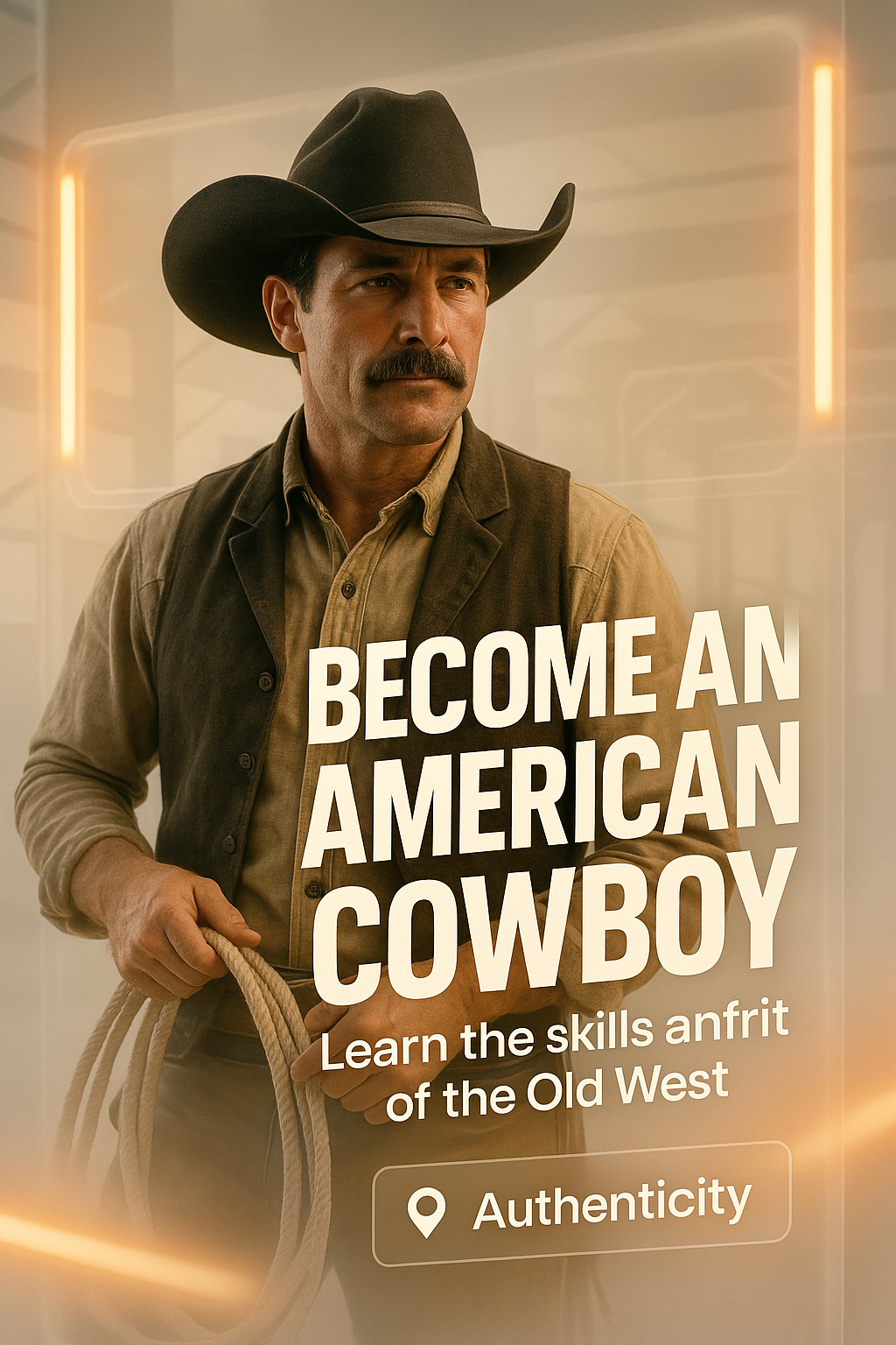 /Collection: /by davooda/Type: PNG/Engaging promotional image featuring a cowboy character, highlighting a training program on Old West skills. The modern design appeals to adventure enthusiasts and aspiring cowboys.