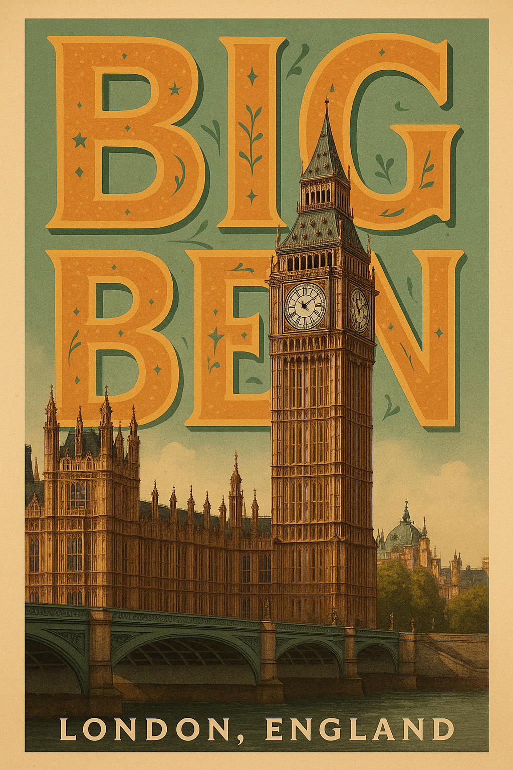 A nostalgic travel poster showcasing Big Ben, with a charming illustration style. Ideal for promoting tourism in London and appealing to art lovers.