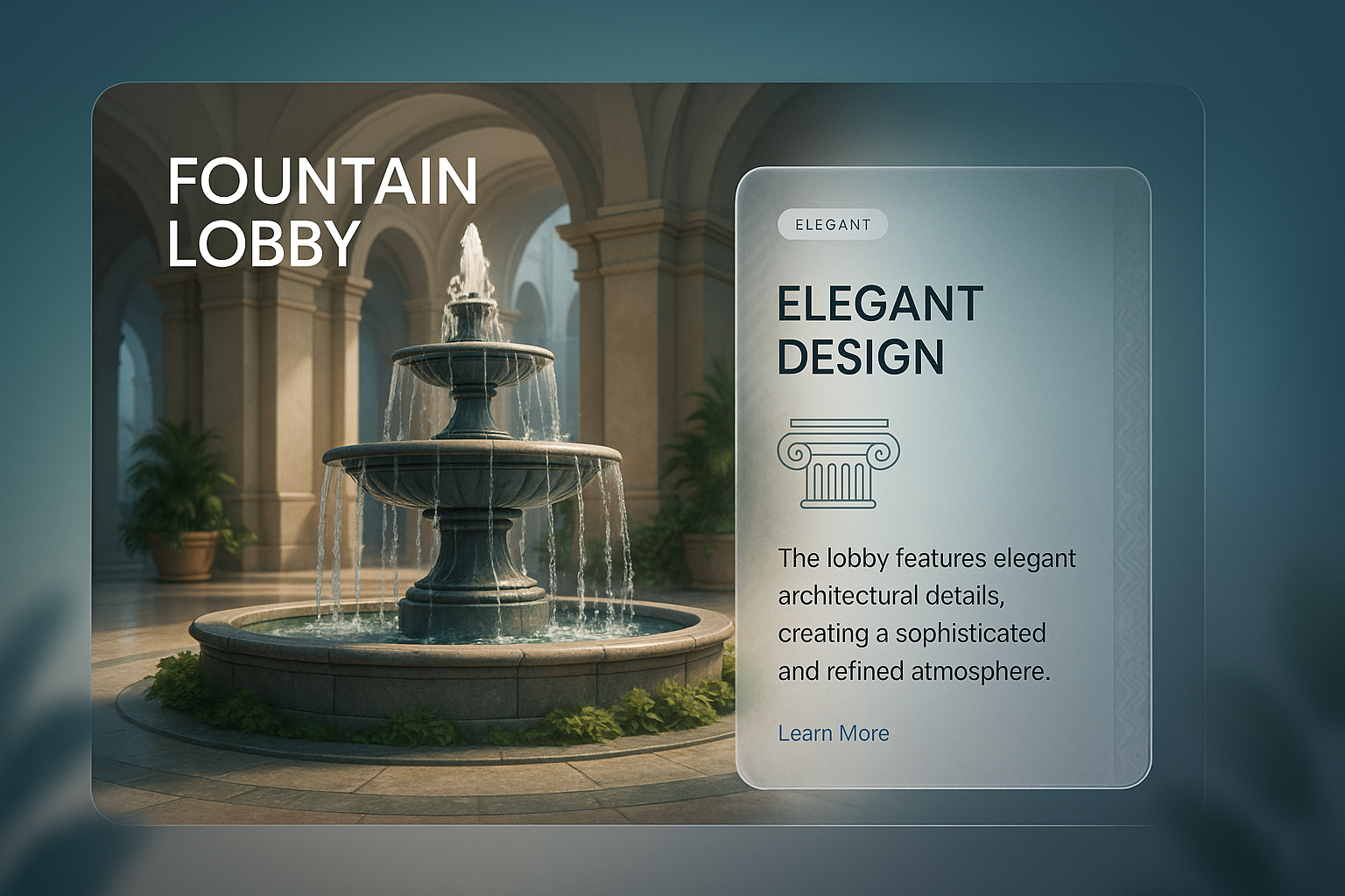 A stunning 3D illustration of a fountain lobby featuring elegant architectural elements. The design includes a gradient background, a sophisticated fountain, and a stylish text block.