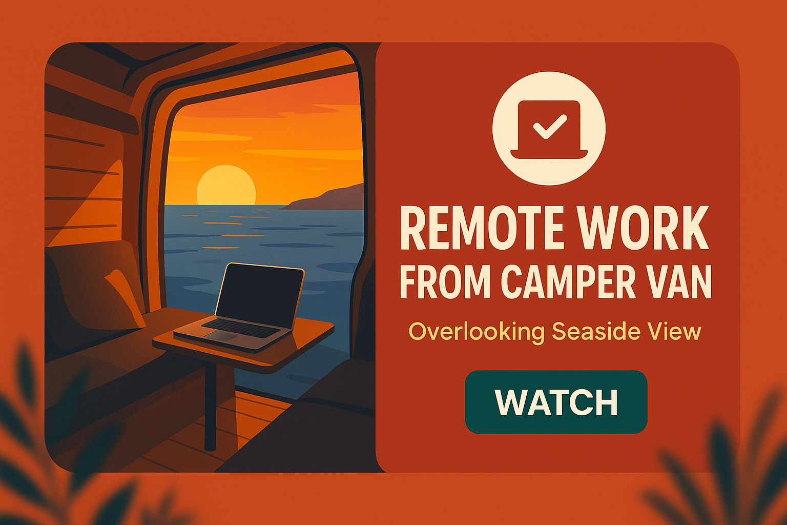 Vibrant promotional image depicting a cozy workspace in a camper van with a seaside sunset view, ideal for marketing remote work opportunities.