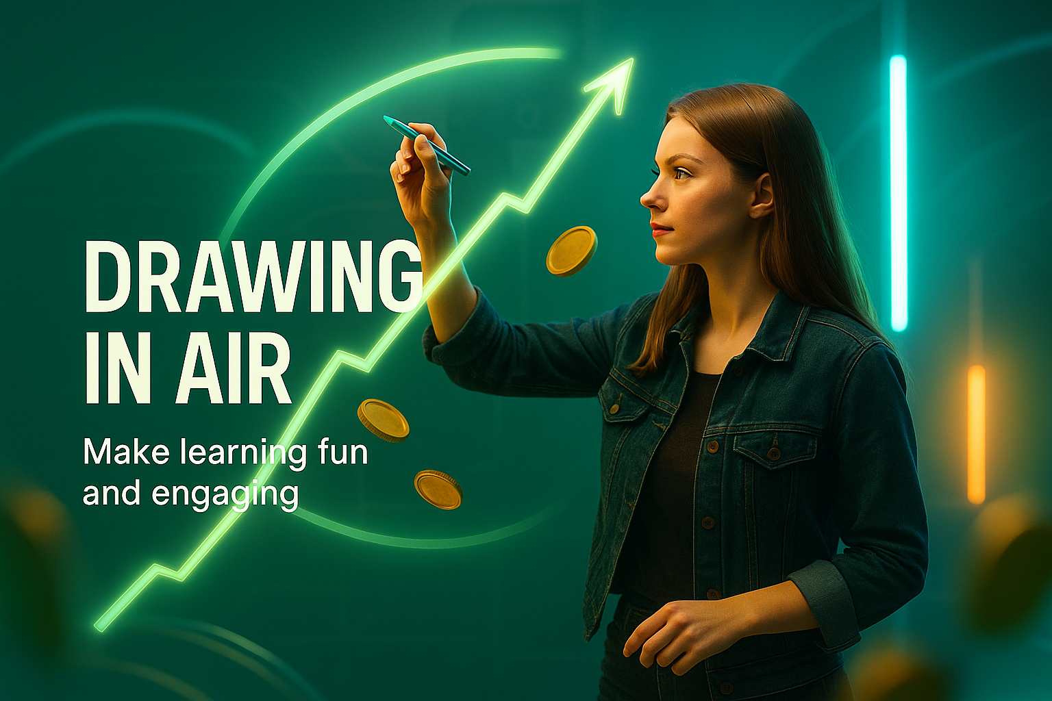 /Collection: /by davooda/Type: PNG/Dynamic image featuring a young woman illustrating concepts in the air, conveying an engaging educational theme. Ideal for promoting innovative learning solutions.