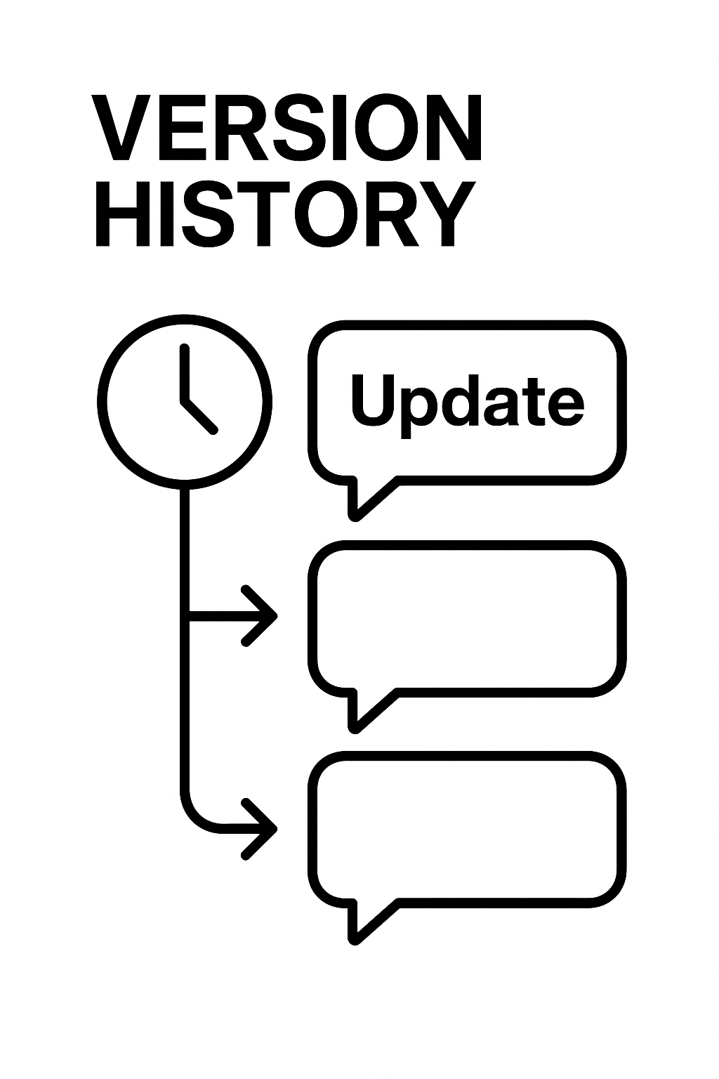 Minimalist infographic illustrating version history with a timeline and update notifications, suitable for software development or project management contexts.