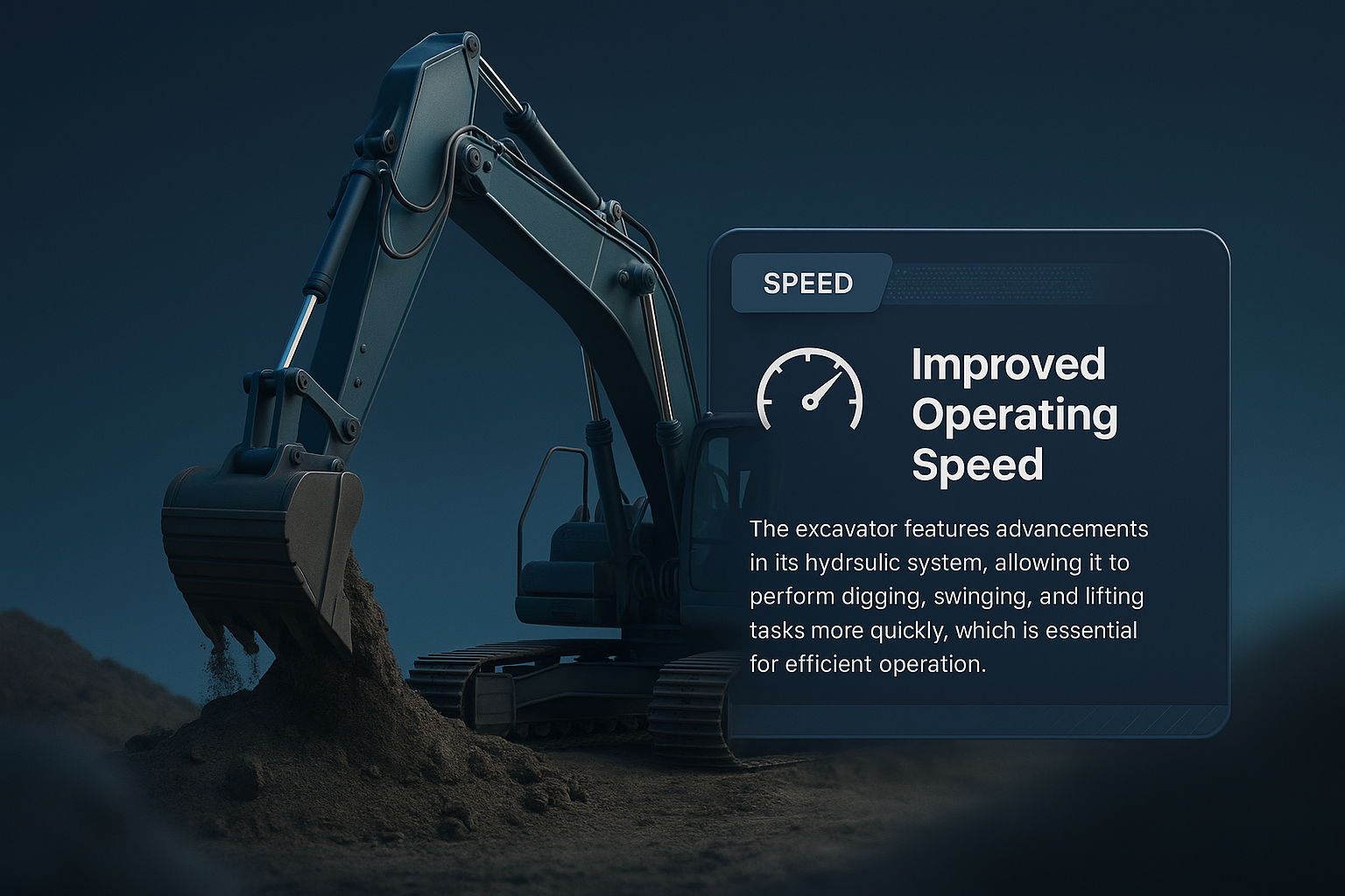 A detailed 3D illustration of a working excavator set against a smooth gradient background. The design includes a feature block showcasing improved operating speed, enhancing visual appeal.