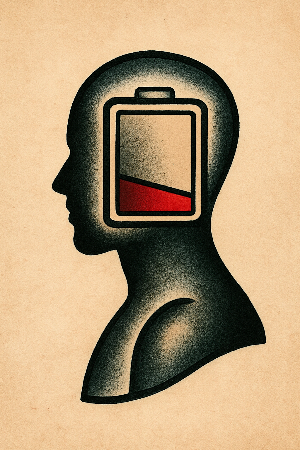 /Collection: /by davooda/Type: PNG/A creative tattoo design featuring a silhouette of a head with a battery icon showing low charge. The artwork is rendered in multiple colors against a light beige background.
