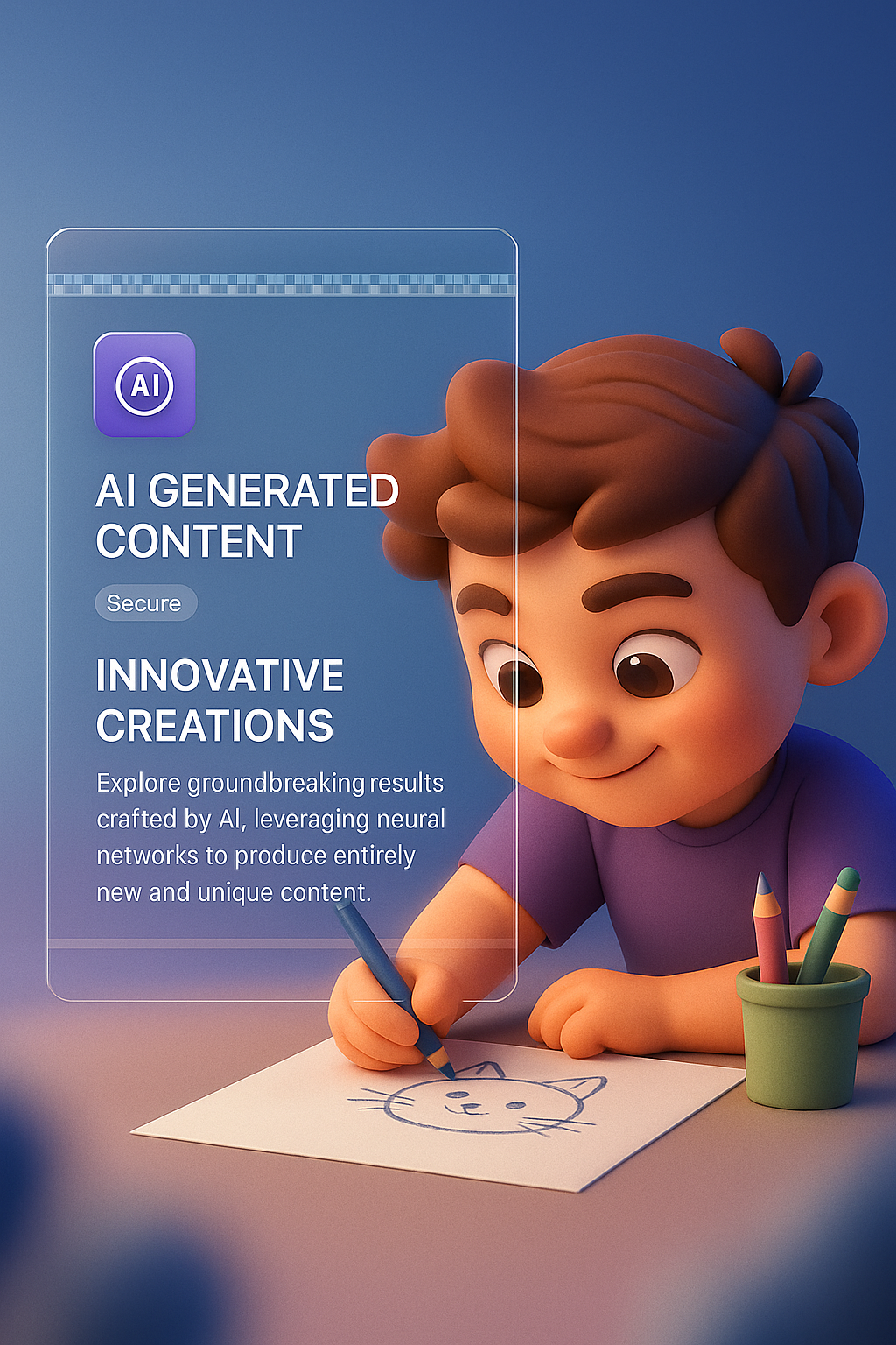A young boy is focused on drawing a cat on white paper, surrounded by vibrant colors and a modern design. The scene features a transparent block displaying innovative AI-generated content.