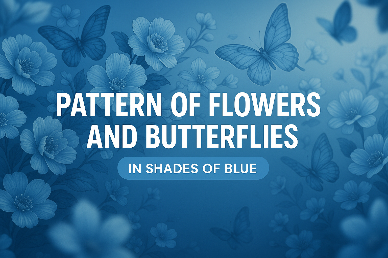 Beautiful pattern featuring flowers and butterflies in varying shades of blue, ideal for backgrounds or decorative designs in digital or print media.