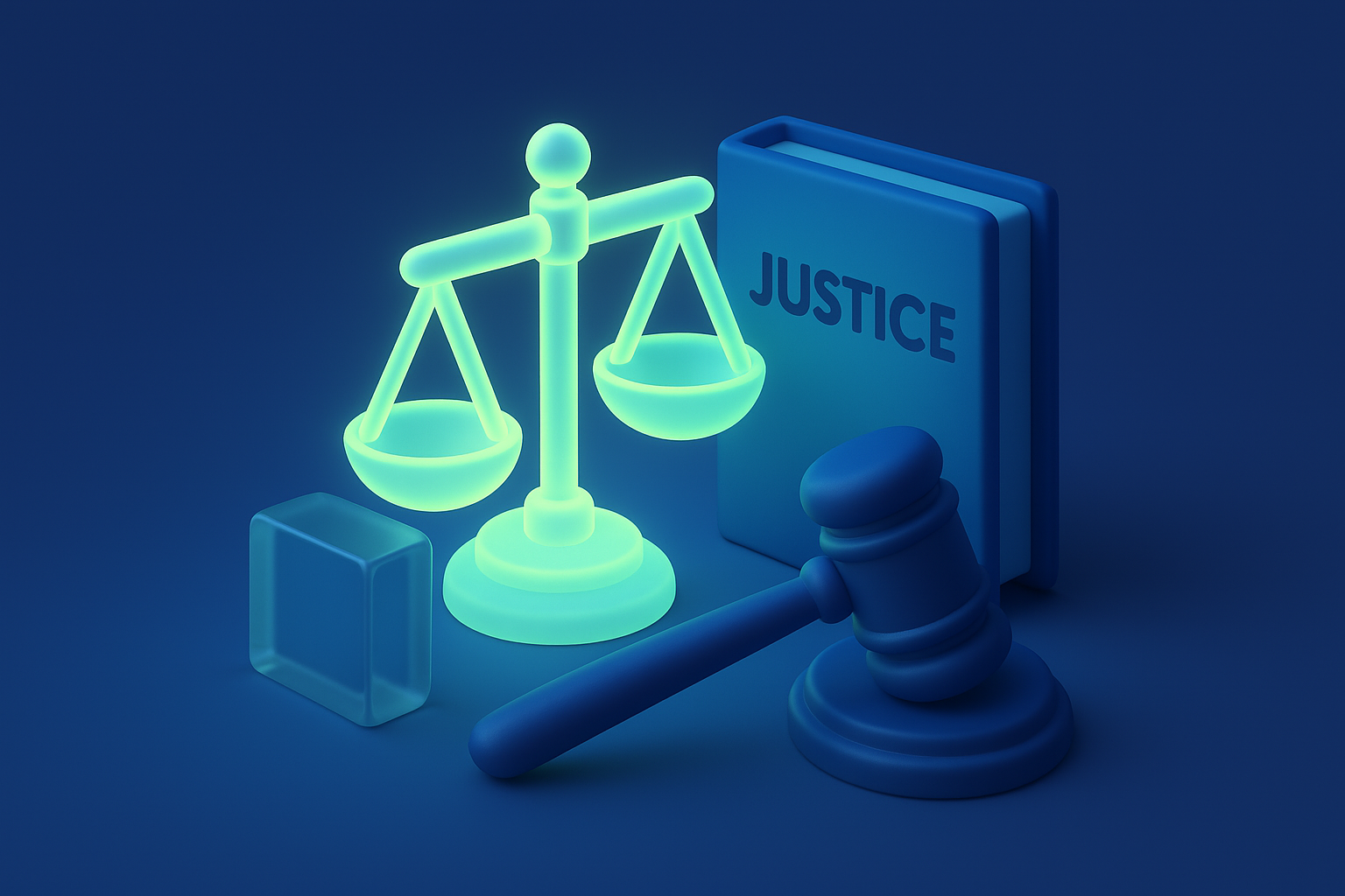 A 3D representation of justice featuring glowing scales, a gavel, and a book labeled 'JUSTICE'. The scene is illuminated by the glowing elements against a solid blue background.