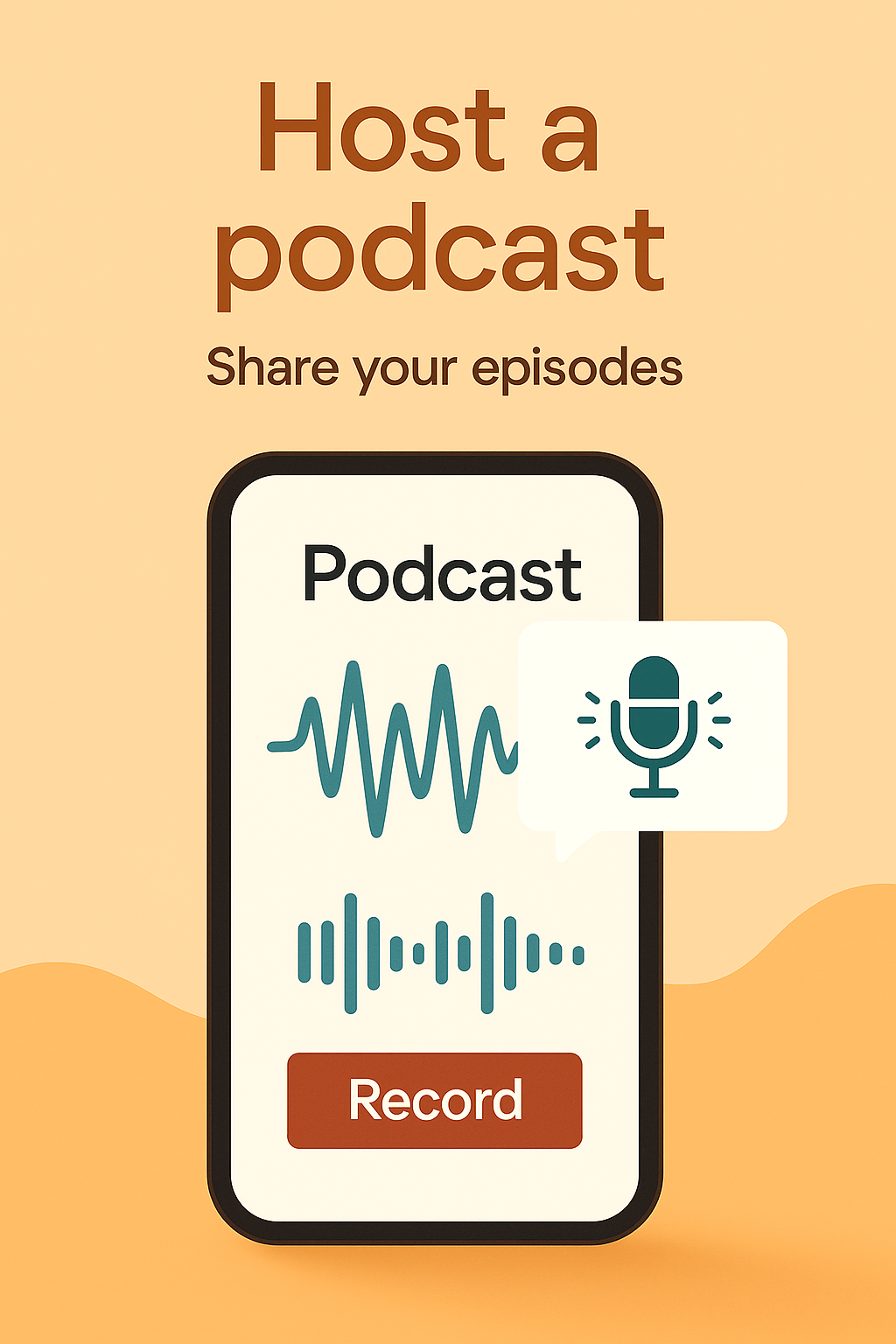 Stylish promotional graphic for podcast hosting services, showcasing a mobile interface with recording features, suitable for social media or website use.