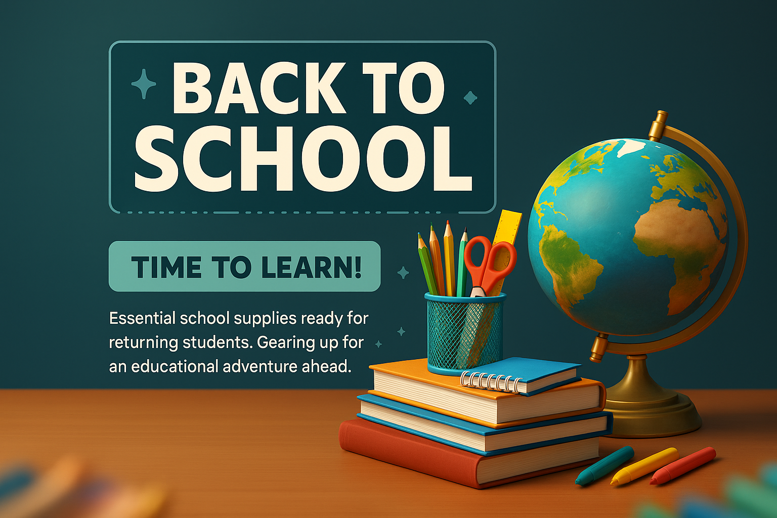 A vibrant scene featuring school supplies like a globe, books, and colorful stationery. The backdrop is a smooth gradient, enhancing the educational theme.