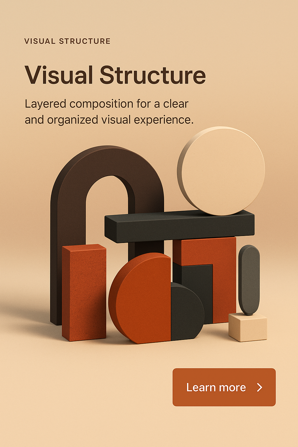 A zoomed-out view of a 3D geometric abstract art composition featuring shapes in earthy tones like beige, brown, and grey. The design emphasizes clarity and organization.