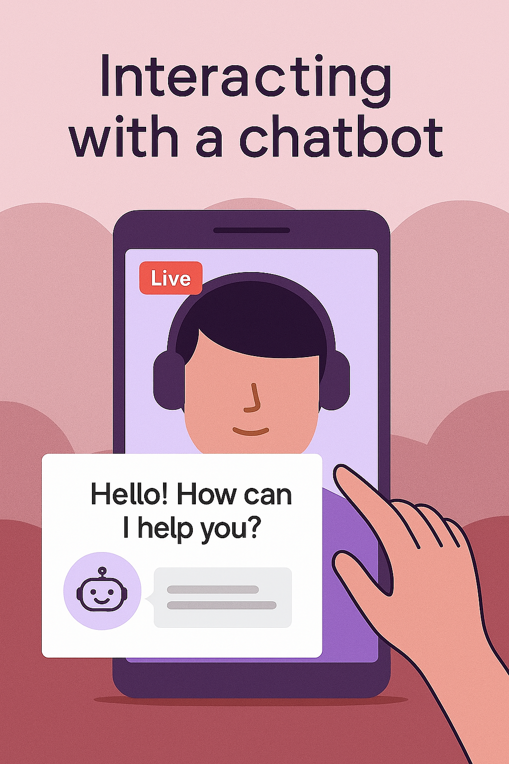 /Collection: /by davooda/Type: PNG/A modern illustration showcasing a user interacting with a chatbot on a mobile device. The design features a friendly character and vibrant colors, ideal for tech-related content.