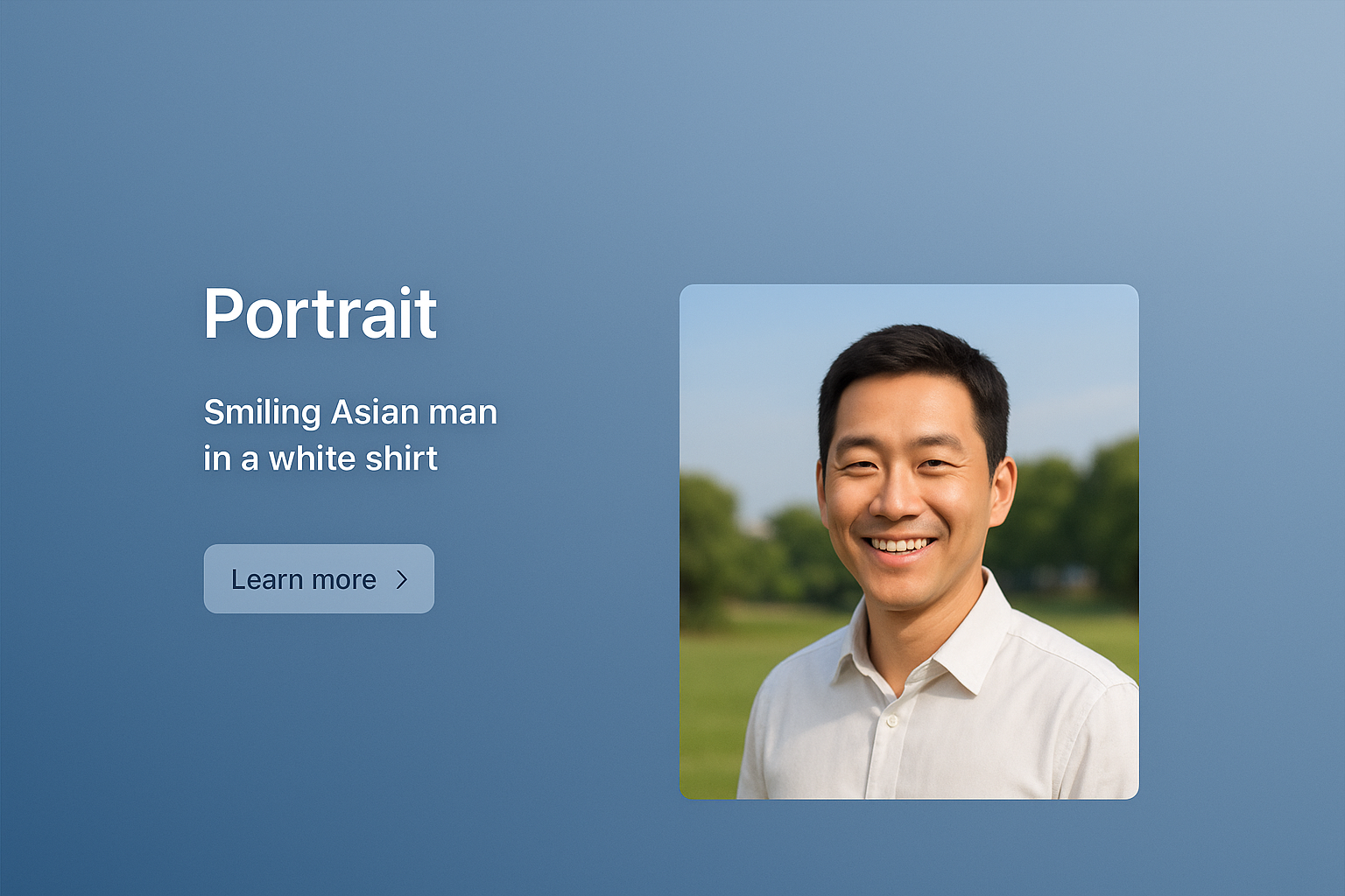 A distant view of a smiling Asian man wearing a white shirt, set against a soft gradient background. The scene captures a serene outdoor atmosphere.