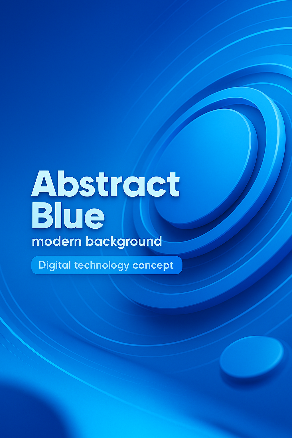 A vibrant abstract blue background featuring layered 3D circular elements. The design emphasizes digital technology with a smooth gradient and engaging typography.