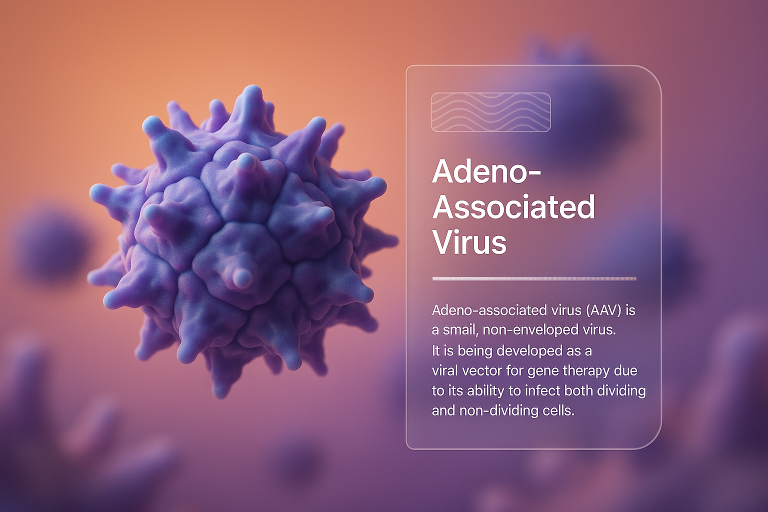/Collection: /by davooda/Type: PNG/A detailed 3D rendering of the adeno-associated virus (AAV), showcasing its structure and features. The design includes a translucent text block with informative content about AAV.