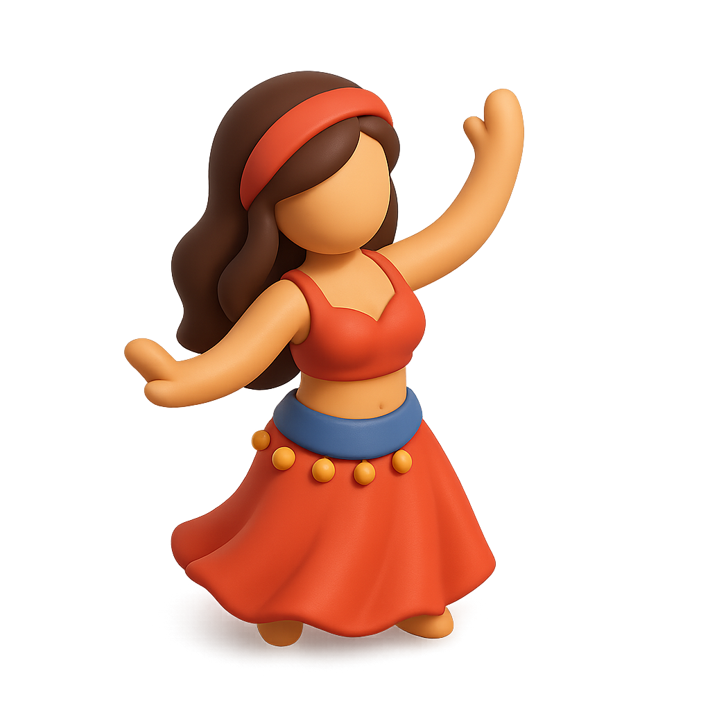 A colorful 3D icon representing a belly dancer, featuring flowing attire and a playful pose. The design showcases volumetric elements and a transparent background.