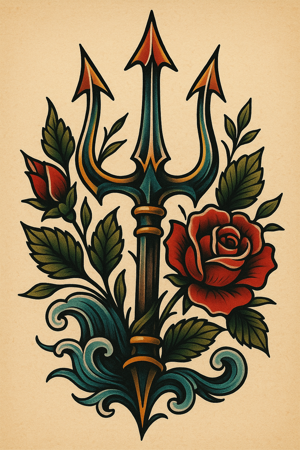 This graphic is a tattoo design showcasing a trident entwined with roses and leaves. The style is bold and colorful, appealing to tattoo enthusiasts and artists.