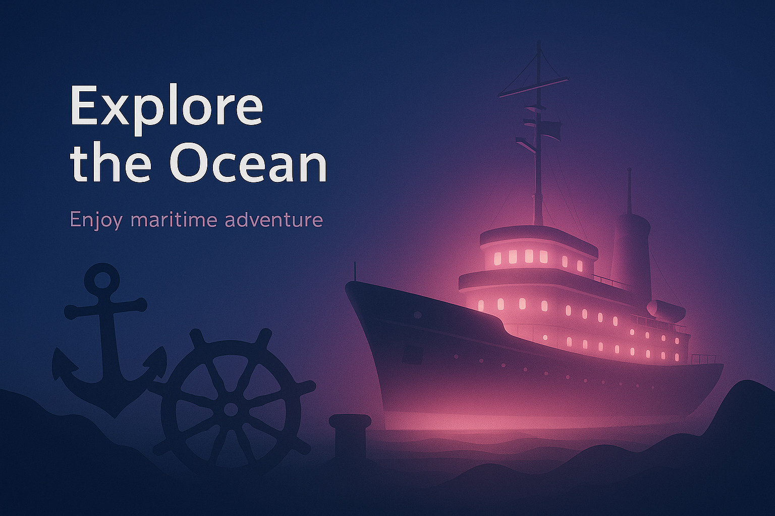 A captivating illustration of a maritime adventure featuring a ship emitting a neon pink glow against a blue backdrop. An anchor and ship wheel add depth to the scene.