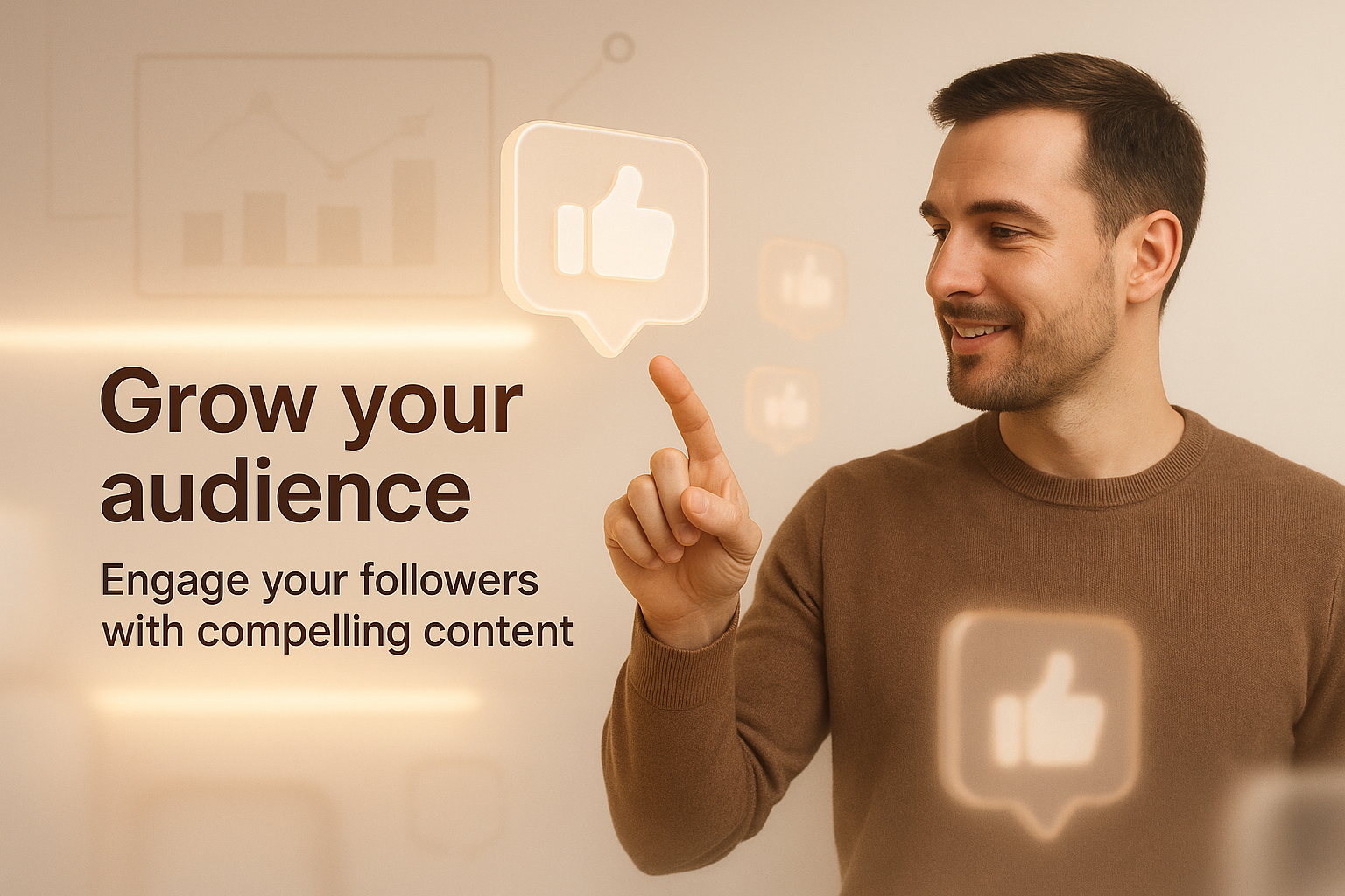 /Collection: /by davooda/Type: PNG/Modern promotional graphic designed to encourage audience engagement on social media, featuring a confident individual and interactive elements. Ideal for marketing campaigns.