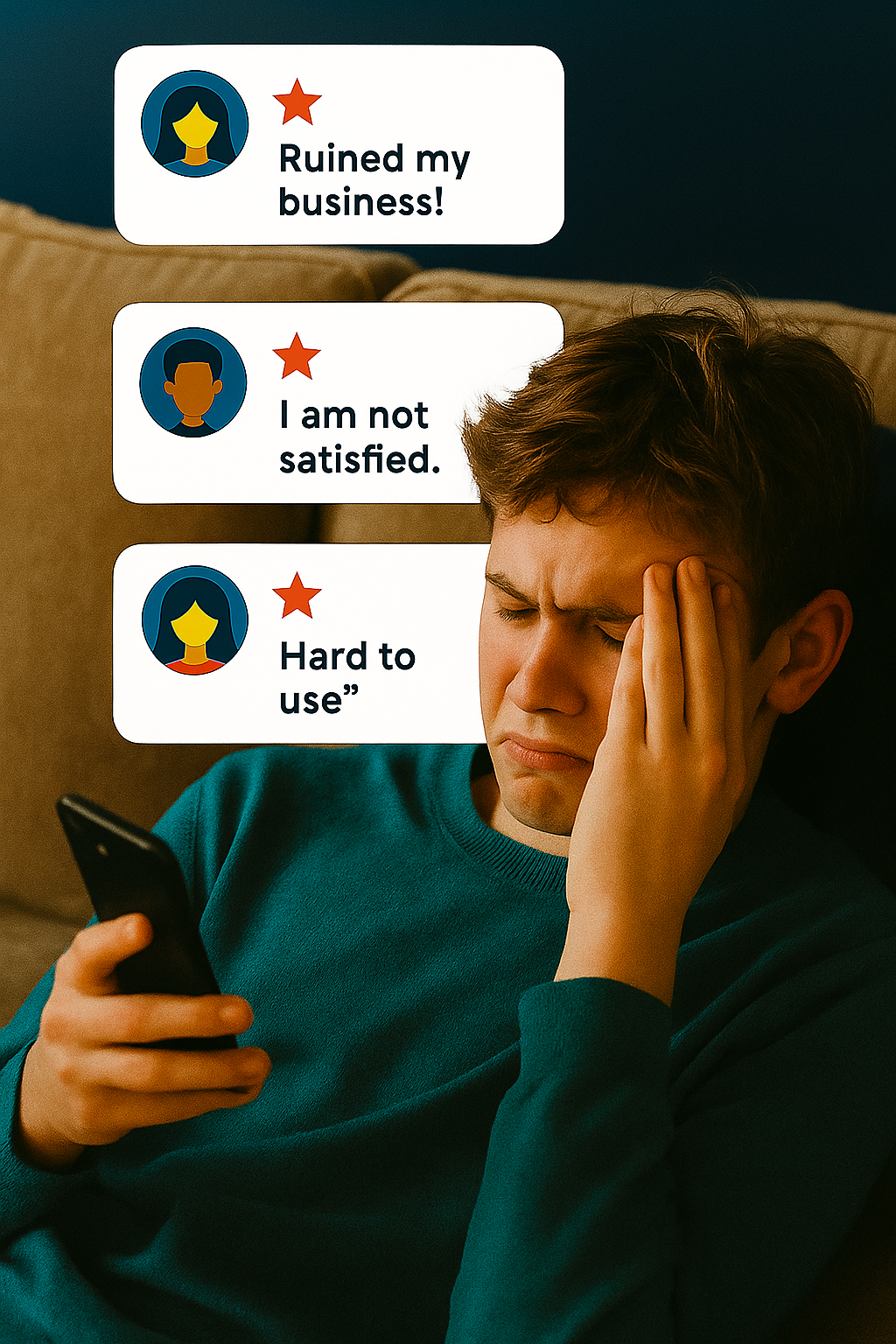/Collection: /by davooda/Type: PNG/A visual representation of user dissatisfaction featuring a young man expressing frustration while reading negative feedback on his phone. Ideal for articles on customer experience.