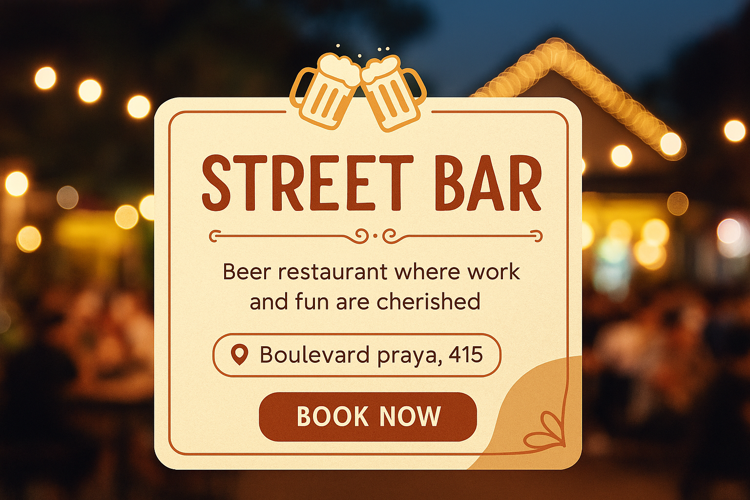 An inviting bokeh background featuring the Street Bar, showcasing a lively outdoor atmosphere with people enjoying dinner and music. The design highlights the bar's inviting ambiance.
