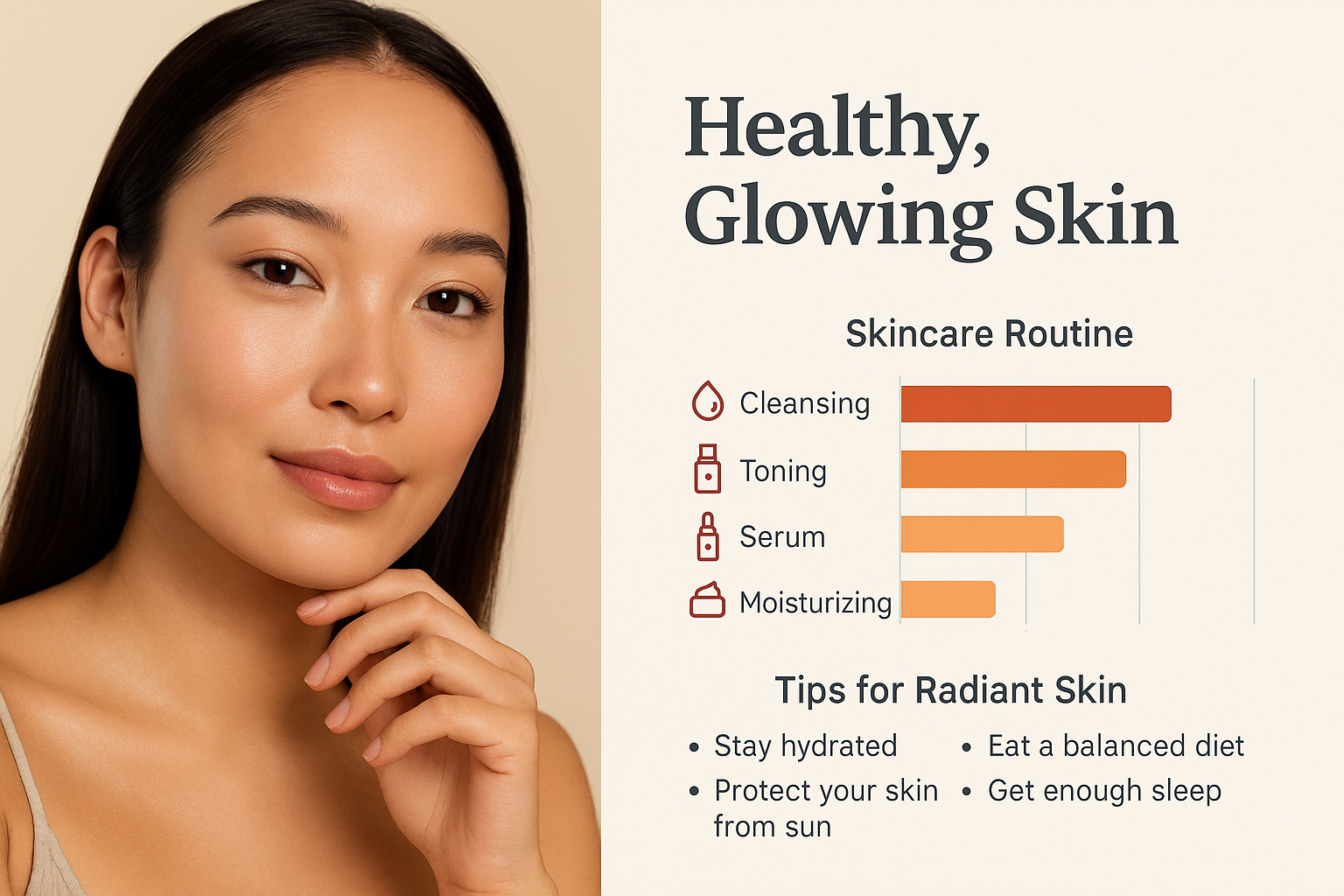 Informative infographic showcasing a skincare routine and tips for achieving healthy, glowing skin. The design combines visuals with text for an engaging presentation.