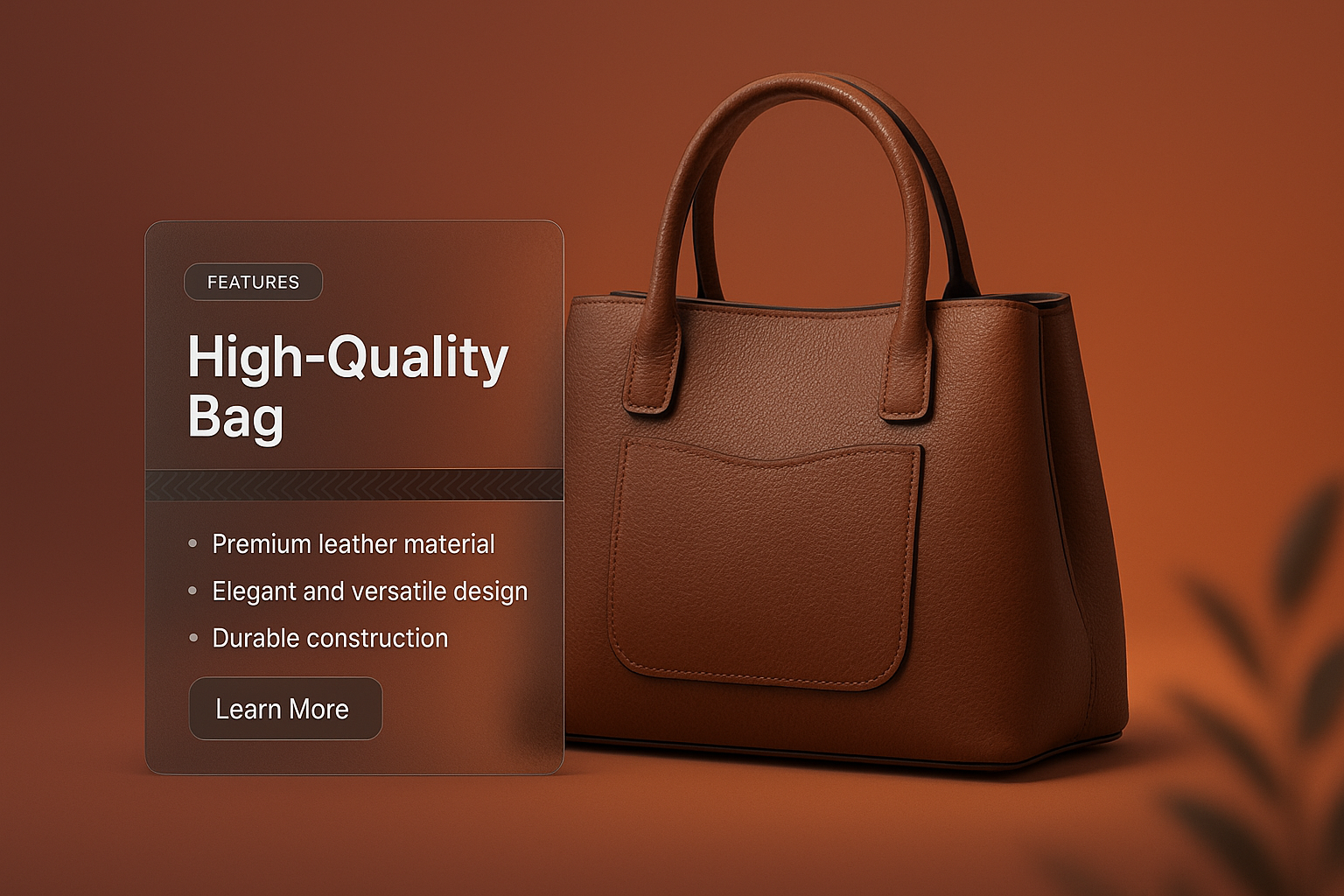A sophisticated 3D illustration of a high-quality leather bag, featuring a transparent glass effect panel with text highlighting its premium attributes.