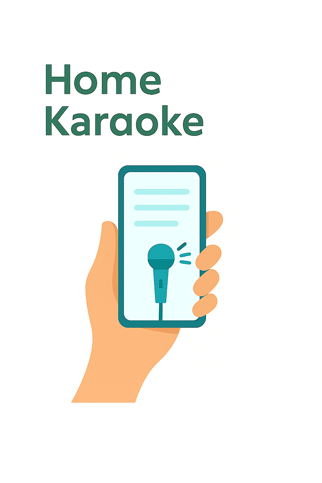 A minimalist illustration featuring a hand holding a smartphone displaying a microphone, symbolizing home karaoke entertainment. Ideal for music apps or home entertainment promotions.