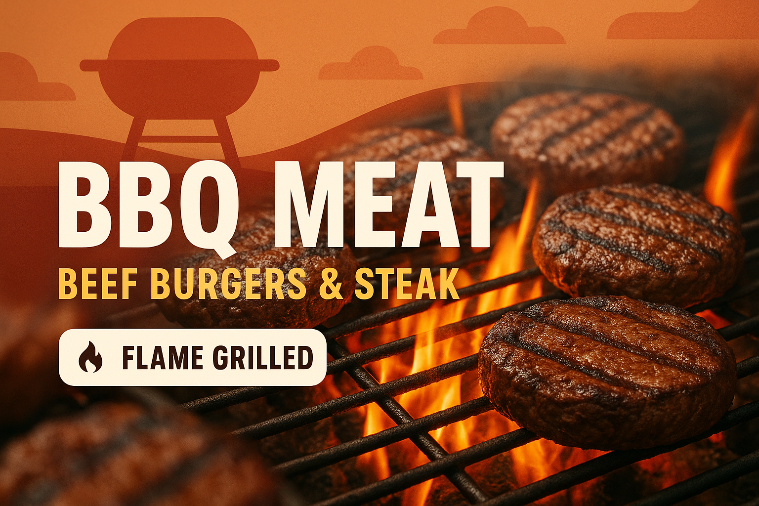 Promotional BBQ Meat Advertisement Featuring Grilled Burgers
