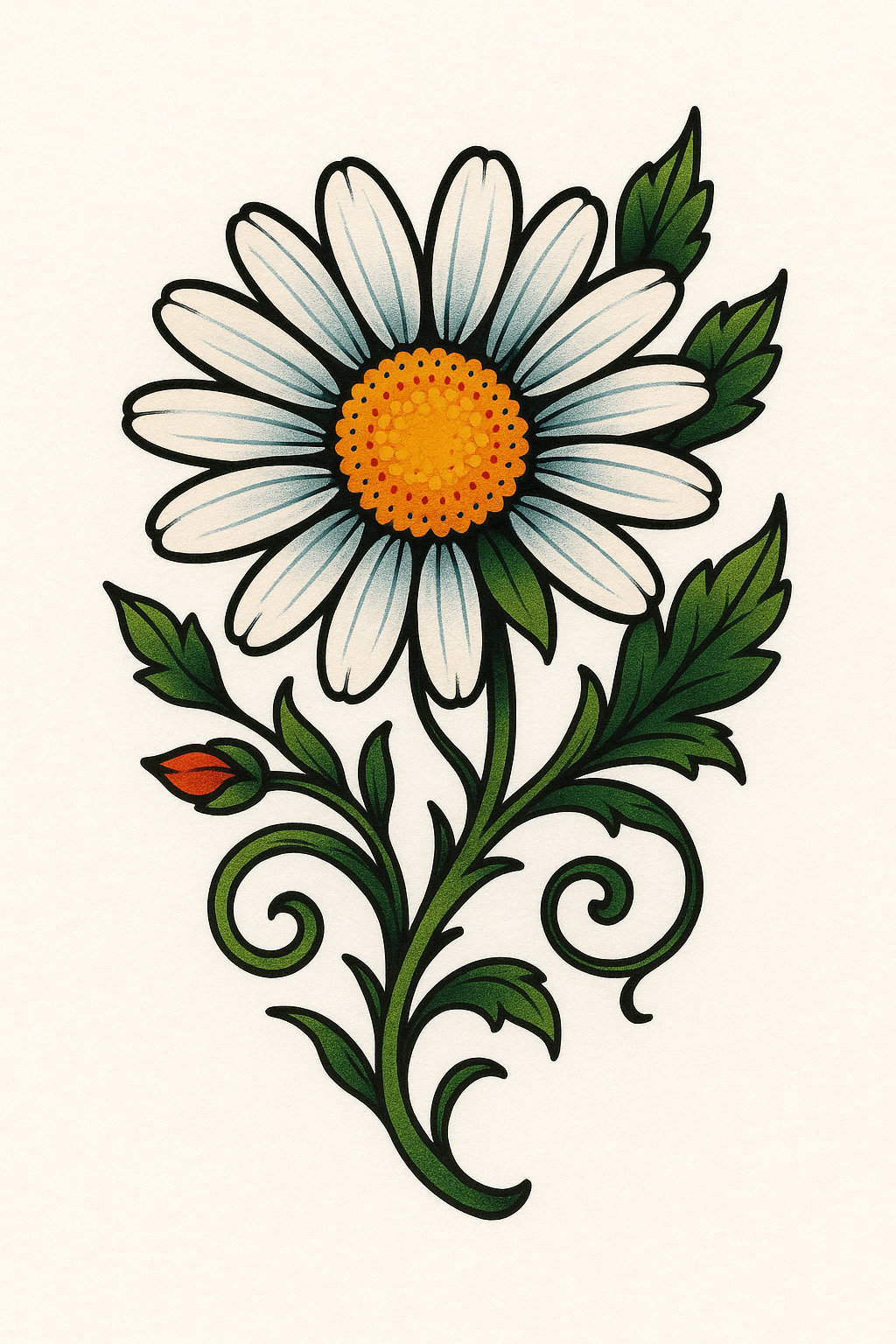 A beautifully detailed illustration of a daisy flower with intricate leaves and a bud, showcasing vibrant colors and a whimsical design style. Ideal for use in art prints, greeting cards, or decorative elements.