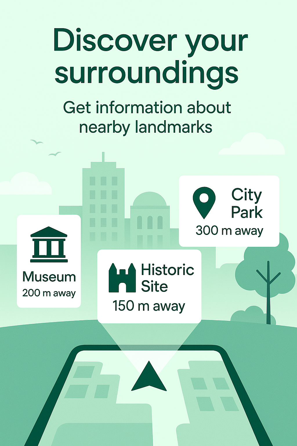 /Collection: , /by davooda/Type: PNG/A clean and modern graphic illustrating a mobile app interface that provides information about nearby landmarks. The design features subtle colors and simple icons, aimed at users seeking to explore their surroundings.