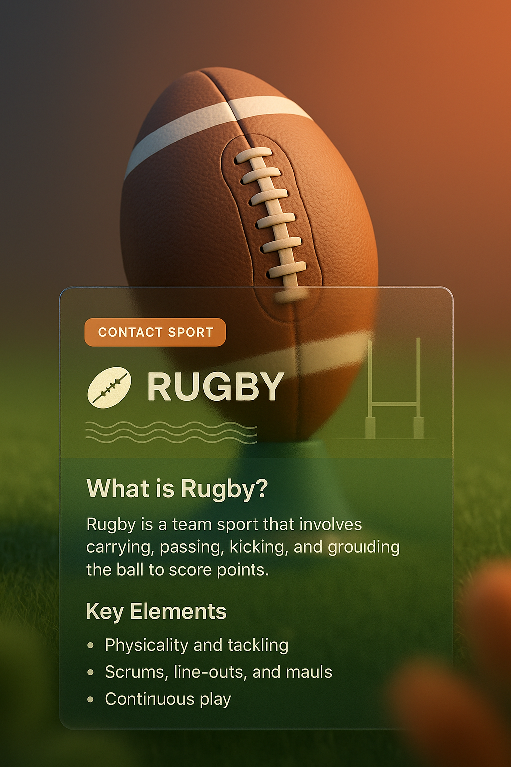 A visually appealing 3D illustration focused on rugby. It features a rugby ball and an engaging transparent glass overlay with key information about the sport.
