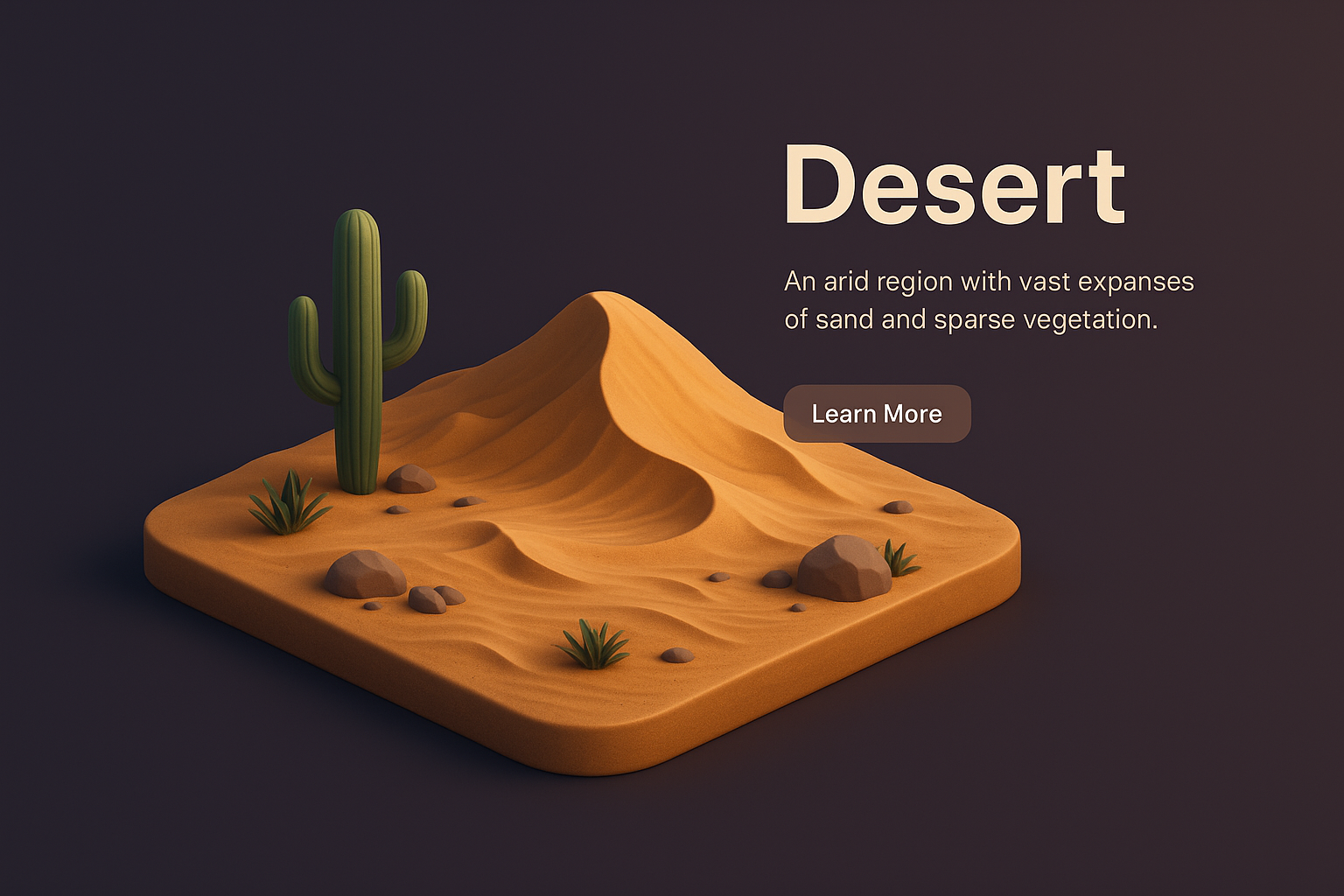 /Collection: /by davooda/Type: PNG/A visually appealing 3D representation of a desert landscape featuring sand dunes, sparse vegetation, and a cactus. The background transitions from dark to a solid color, enhancing the overall realism.