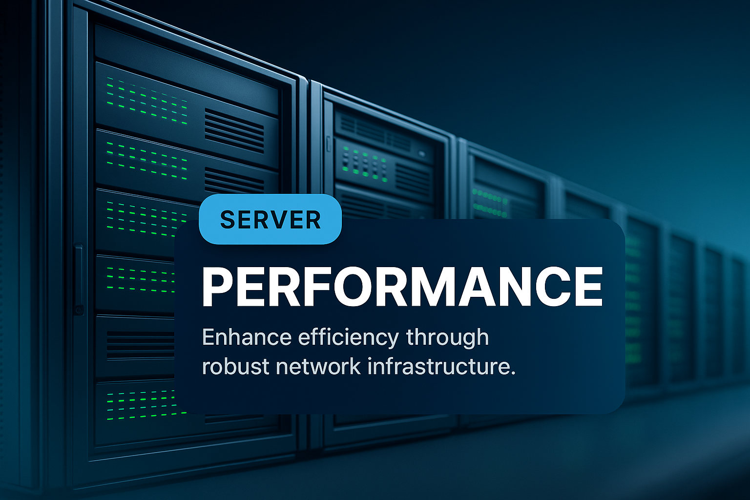 A visually striking representation of a row of network servers adorned with glowing LED lights. The scene emphasizes robust infrastructure and performance.