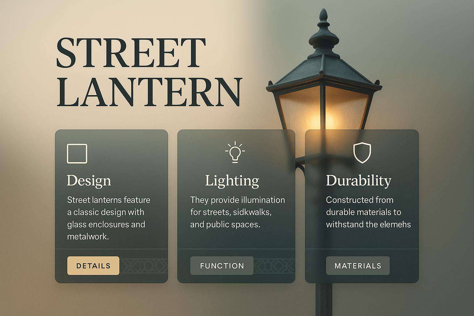 /Collection: /by davooda/Type: PNG/A stylish street lantern featuring a classic design, accompanied by informative blocks on design, lighting, and durability, all set against a soft gradient background.