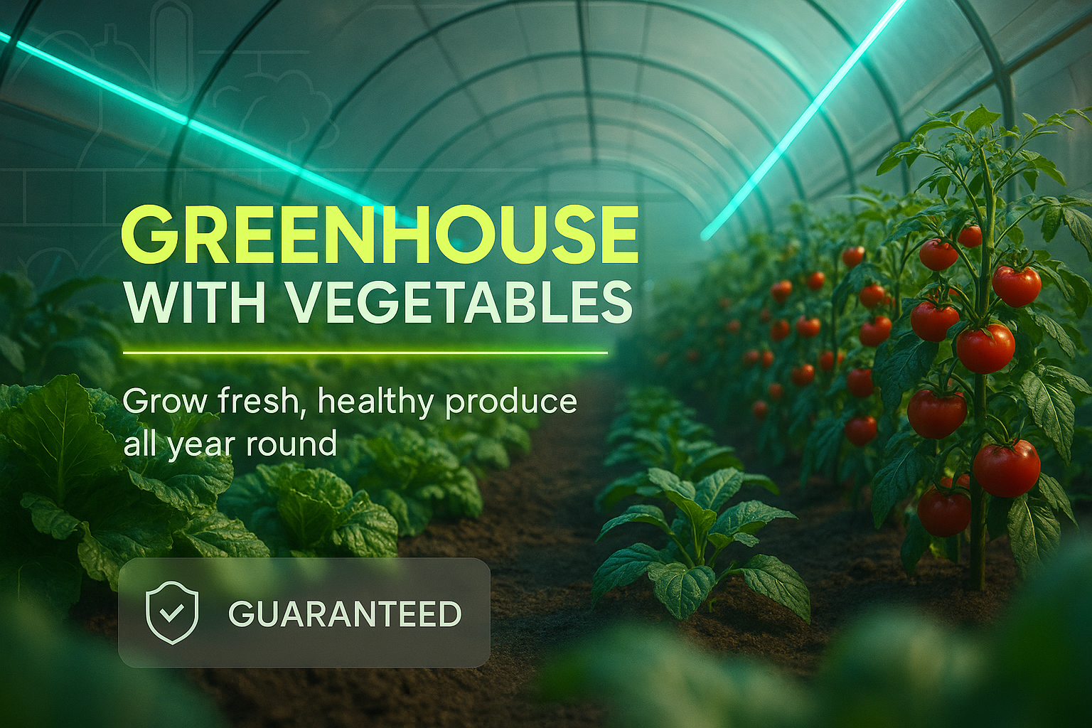Vibrant image of a modern greenhouse showcasing healthy vegetable plants, ideal for agricultural marketing or gardening promotion.