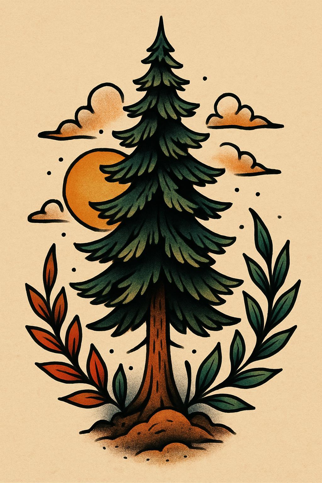 Stylized Evergreen Tree with Sunset and Clouds Illustration
