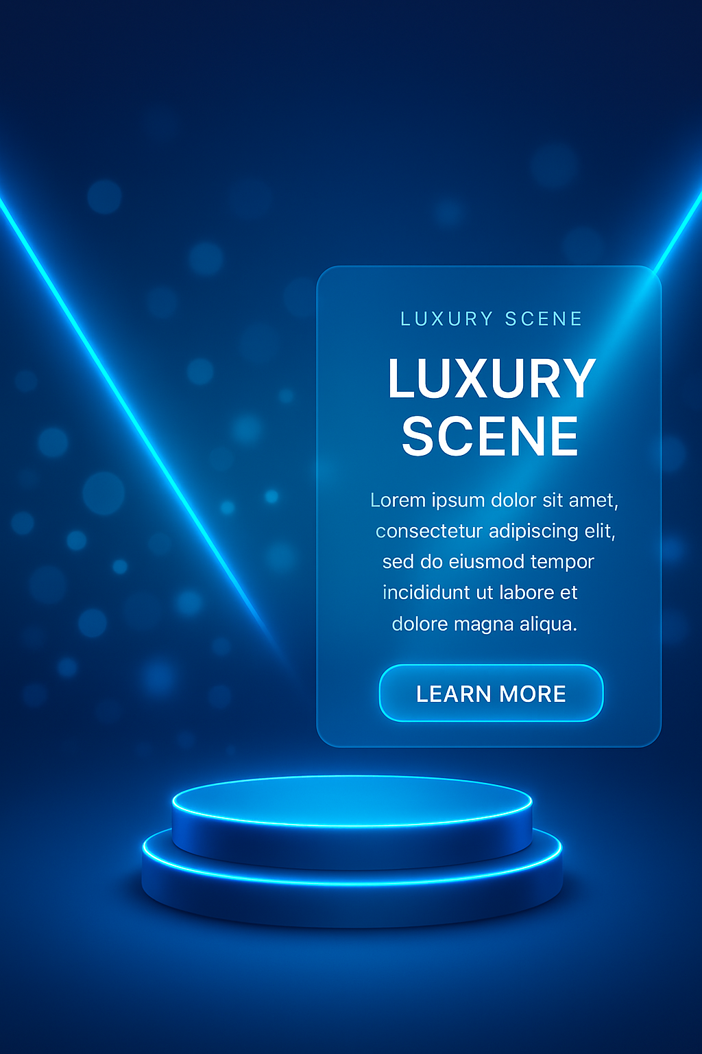/Collection: /by davooda/Type: PNG/An empty futuristic podium illuminated by neon blue lights against a dark background. The scene features soft bokeh effects and glassmorphism panels for a luxurious appearance.
