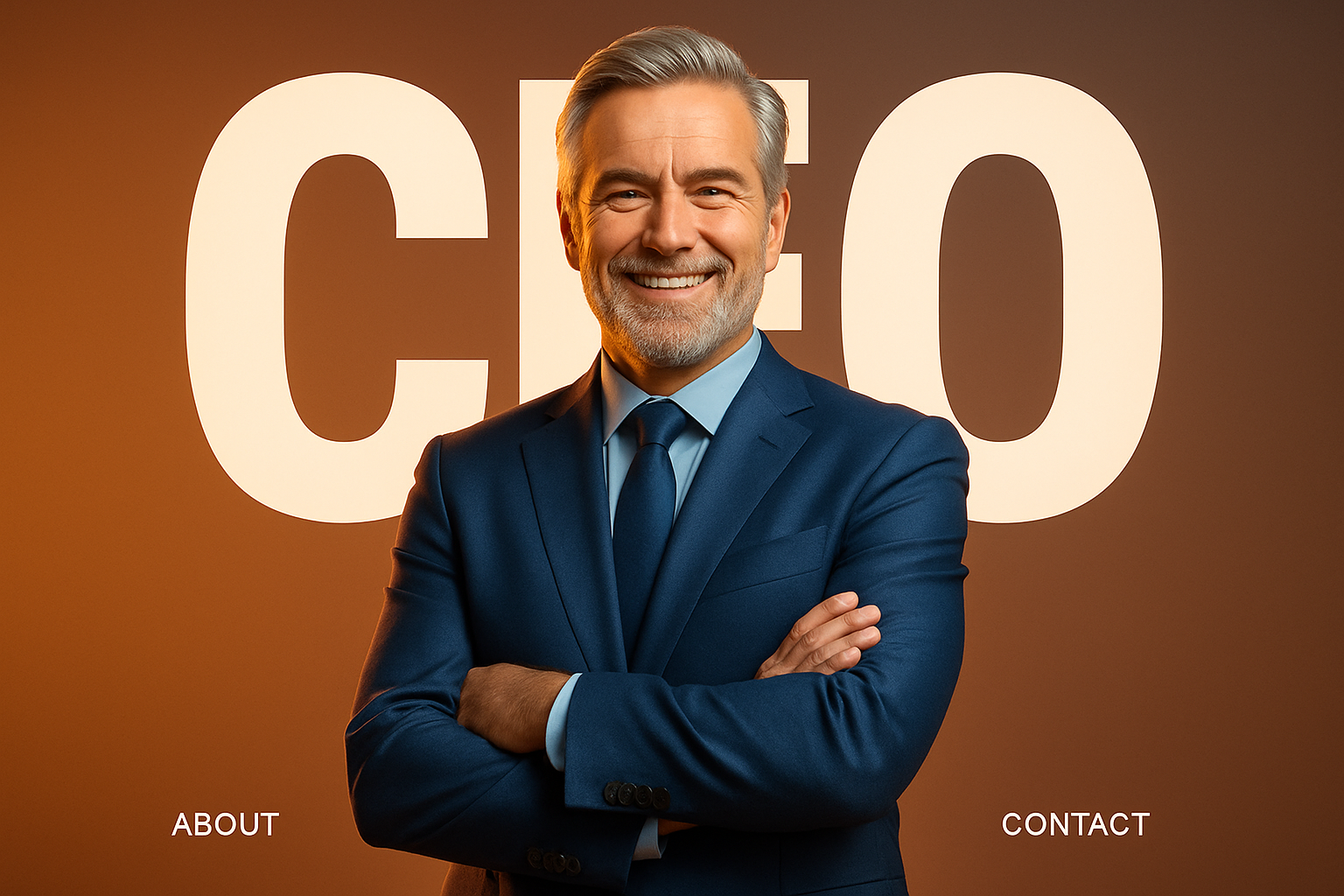 /Collection: /by davooda/Type: PNG/A confident middle-aged businessman stands in an office with arms crossed, wearing a blue suit. The background features a gradient with bold typography, creating a modern and cinematic atmosphere.