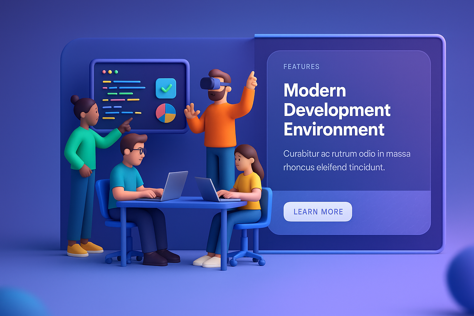 /Collection: /by davooda/Type: PNG/A vibrant 3D illustration of a team of software developers working together in a modern development environment, featuring coding, collaboration, and application testing.