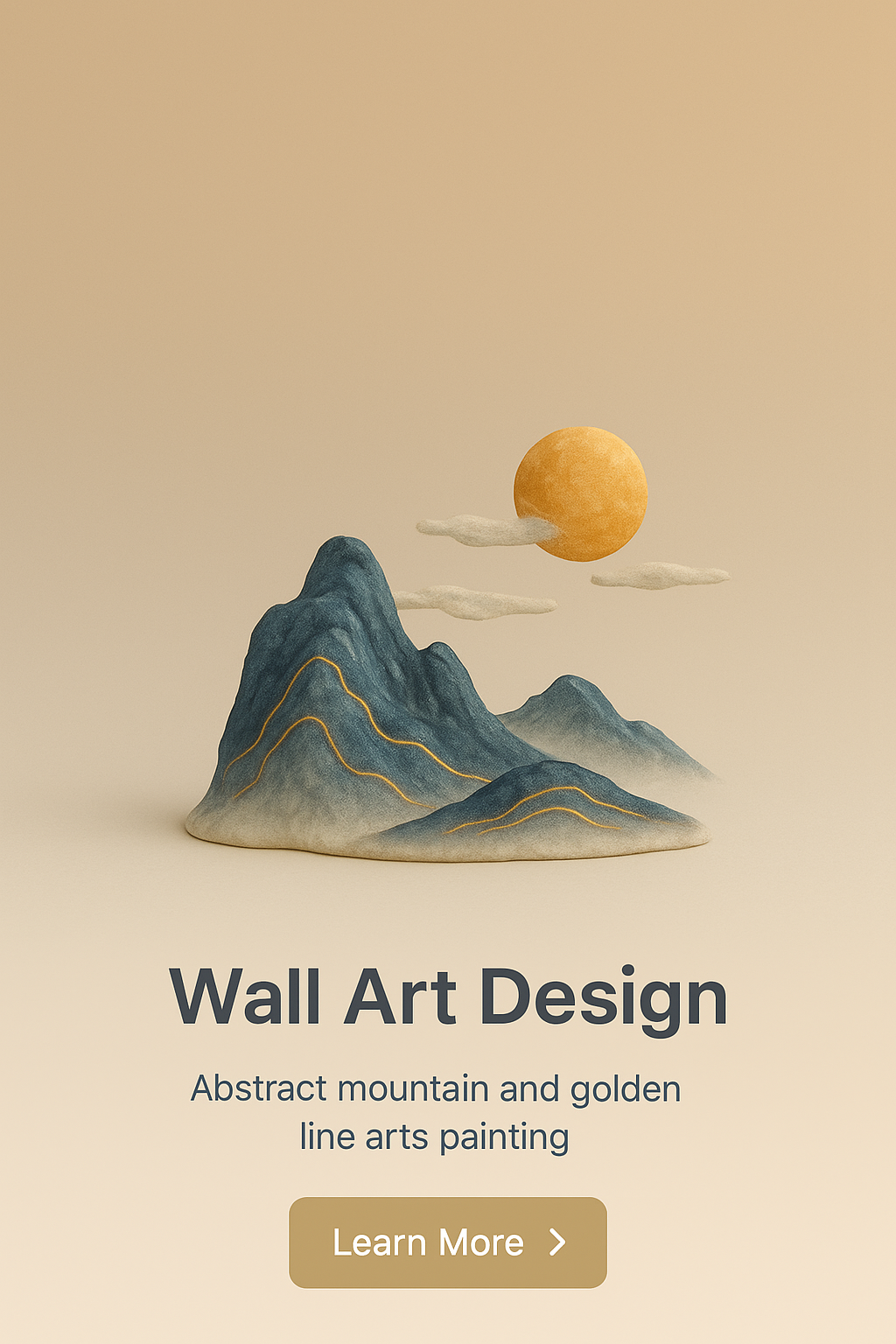 A beautifully crafted 3D scene featuring abstract mountains, a golden sun, and soft clouds. The minimalistic watercolor style creates a serene atmosphere for wall art design.